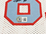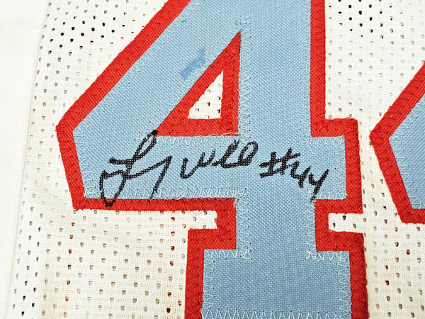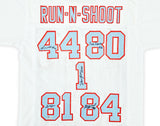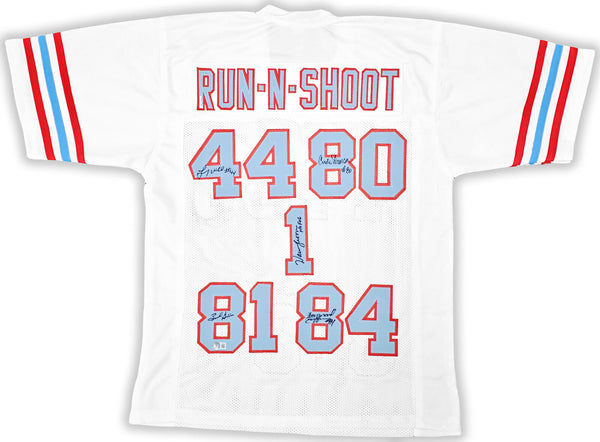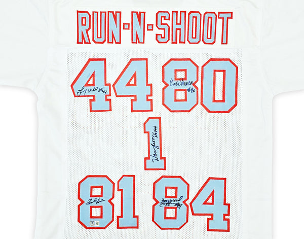 This is a White Jersey that has been hand signed by 5 members of the Houston Oilers Run & Shoot. These members are Warren Moon, Curtis Duncan, Ernest Givins, Haywood Jeffries, and Lorenzo White. This is a custom jersey with no name brand. The approximate size is XL. It has nice sewn in name and numbers. This item has been witnessed and certified authentic by Beckett Authentication (BAS) and comes with their tamper-proof witness sticker.