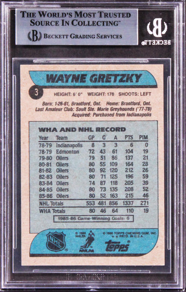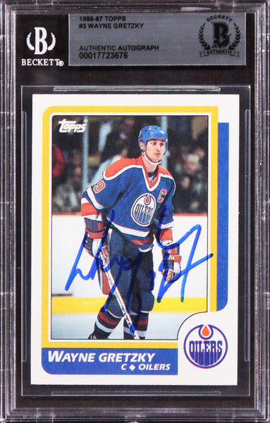 This Autographed 1986 Topps #3 Card has been Personally Signed by Wayne Gretzky of the Edmonton Oilers. This item is 100% Authentic, it comes slabbed and authenticated by Beckett Authentication Services. The authenticity can be verified on Beckett Authentication Services website.