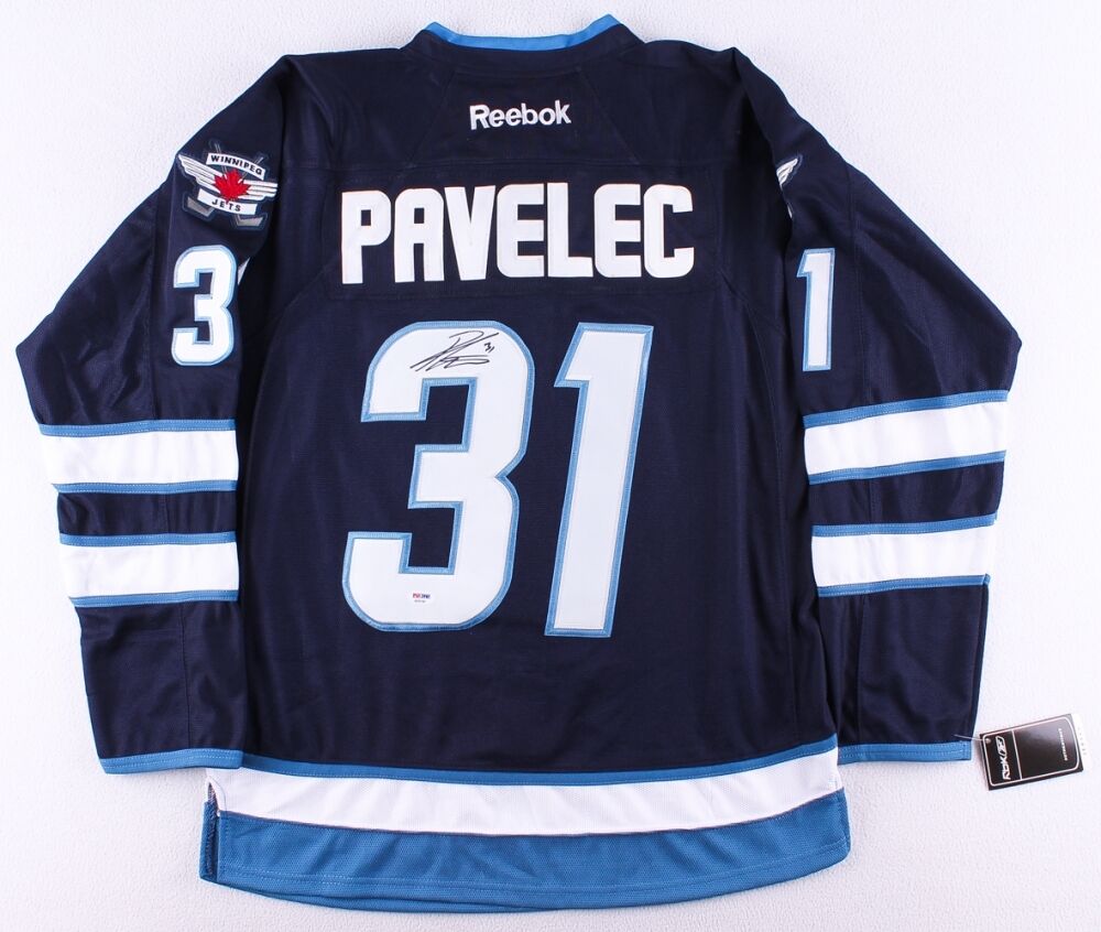 Reebok on-ice style jersey. Everything is sewn on, size 50. Hand-signed in black felt-tip pen by Ondrej Pavelec. Please note jersey has some minor staining on the reverse side of the jersey see photo for details. The autograph includes an official PSA/DNA hologram and matching COA for authenticity purposes.Authentication: PSA COA Save on shipping when buying multiple items.