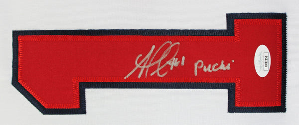 This Autographed White Pro Style Jersey with the inscription of "Puchi" has been Personally Signed by Ozzie Albies of the Atlanta Braves. This item is 100% Authentic to include a Certificate of Authenticity (COA) / hologram by JSA. The authenticity can be verified on JSA website. This is a X-Large sized, non-branded, custom-stitched Jersey.