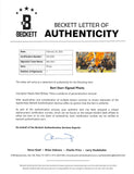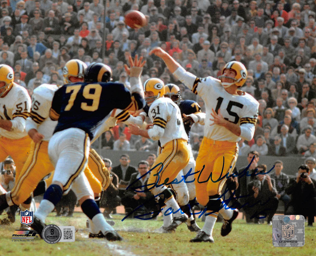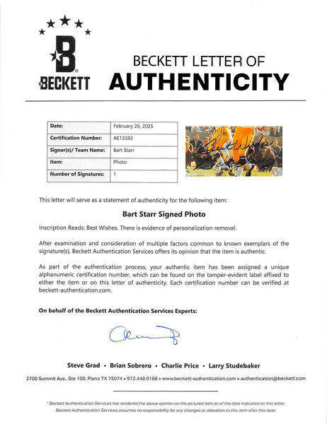 This Autographed 8x10 Photo with the inscription of "Best Wishes" has been Personally Signed by Bart Starr of the Green Bay Packers. This item is 100% Authentic to include a Certificate of Authenticity (COA) / hologram by Beckett Authentication Services. The authenticity can be verified on Beckett Authentication Services website. There is evidence of a personalization removal.