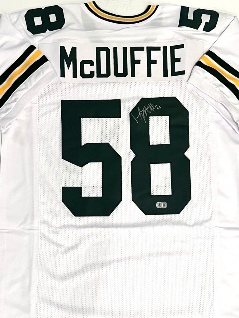 Custom Replica jersey hand signed by Green Bay Packers Linebacker ISAIAH McDUFFIE. The signature is in Silver Paint Pen. This jersey was signed at a private signing with us and would make a great addition to any Packers collection! The jersey size is XL and all letters and numbers are sewn in.This autograph is guaranteed to be 100% authentic and will include a COA hologram from Beckett authentication.