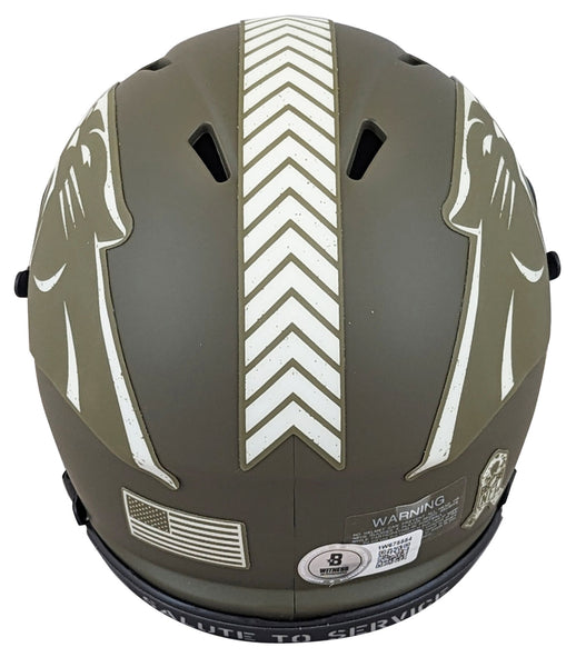 This Autographed Alternate Salute To Service Speed Mini Helmet W/ Uv Mirrored Back Acrylic Display Case has been Personally Signed by Luke Kuechly of the Carolina Panthers. This item is 100% Authentic to include a Certificate of Authenticity (COA) / hologram by Beckett Authentication Services. This is a BAS Witnessed Protection Program item which means a Beckett Authentication Service representative was present when this item was being signed. We conducted an autograph signing with Luke Kuechly where multiples of the same item were signed. While the photographs are representative of this item, the size, placement and strength of the signature may vary. Each item is hand signed, therefore, each autograph is unique. This item can be verified through BAS Witnessed.
