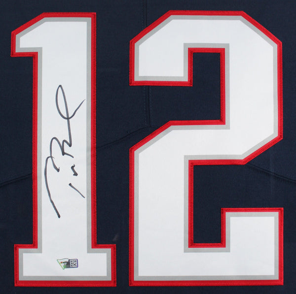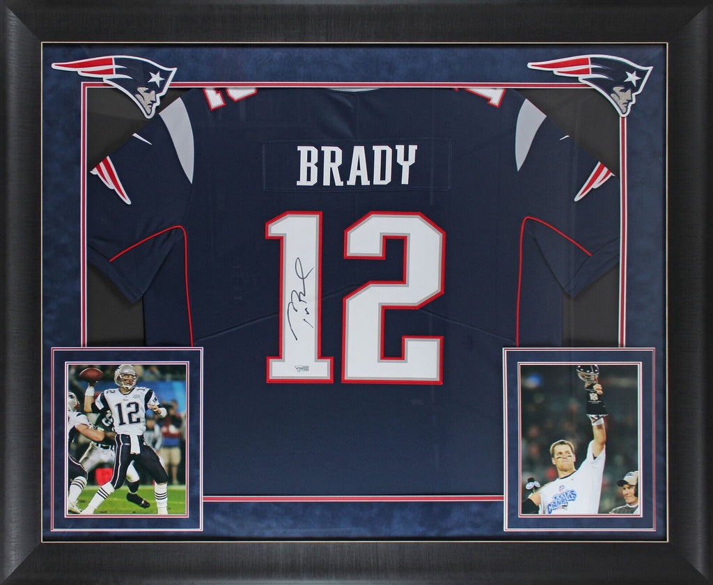 This Autographed Navy Blue Nike Framed Jersey has been Personally Signed by Tom Brady of the New England Patriots. This item is 100% Authentic to includes a numbered hologram by Fanatics. We conducted an autograph signing with where multiples of the same item were signed. While the photographs in this listing are representative of this item, the size, placement and strength of the signature may vary. Each item is hand signed, therefore, each autograph is unique.