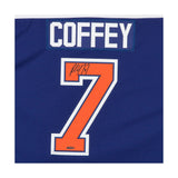 Paul Coffey was selected in the first round of the 1980 NHL® Draft, sixth overall, by the Edmonton Oilers® after a successful campaign with the Sault St. Marie Greyhounds and Kitchener Rangers. In his rookie season, Coffey recorded 32 points. He followed that up with an incredible 89 points in his sophomore season. The Oilers® won their second straight Stanley Cup® in the 1984-85 season, and Coffey won the Norris Trophy awarded to the league's best defenseman. This authentic CCM Edmonton Oilers® away jersey complete with stitching and fight strap is the perfect collector's item for any true Oilers fan. Coffey has signed the back of this authentic CCM blue jersey in black paint pen. Coffey's signature was witnessed under UDA's Five-Step Authentication Process.