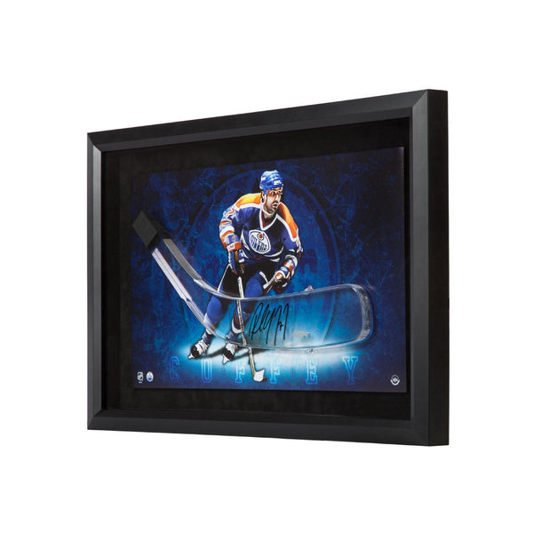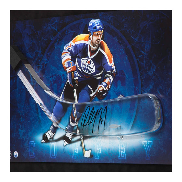 Paul Coffey fit his size 8 feet into size 6 skates to improve his control and enhance his ability to navigate the ice. Coaches and players alike remember Coffey for his tremendous speed. Glen Slather, his coach on the Oilers, told reporters that "he's probably the greatest skater I've ever seen." Coffey recorded 1,531 points in the 1,409 NHL games he played in over his 21-season career. This specially designed shadow box contains a 20" x 12" UDA designed Edmonton Oilers image with an autographed clear acrylic stick blade mounted over the image. Coffey has inked his signature in black paint pen. The overall framed piece measures 24" x 16". Coffey's signature was witnessed under UDA's Five-Step Authentication Process.