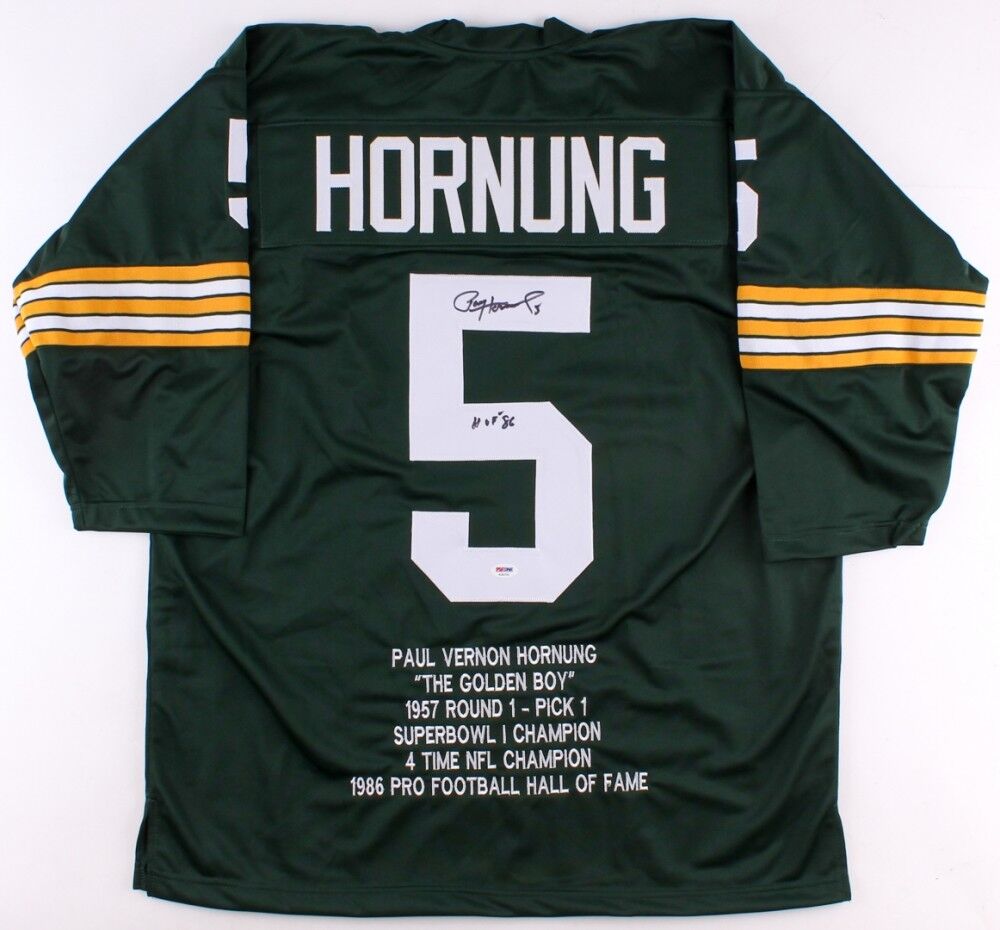 Custom on-field style jersey, size XL. Hand-signed and inscribed in black felt-tip pen by Paul Hornung (HOF). The lot / autograph(s) includes an official PSA/DNA hologram and matching COA for authenticity purposes.Authentication: PSA COA