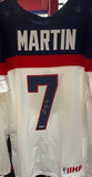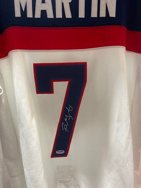 Nike on-ice style jersey. Everything sewn on, size adult Large. Hand-signed in silver paint pen by Paul Martin (San Jose Sharks).The autograph includes an official PSA/DNA hologram and matching COA for authenticity purposes.Authentication: PSA COA