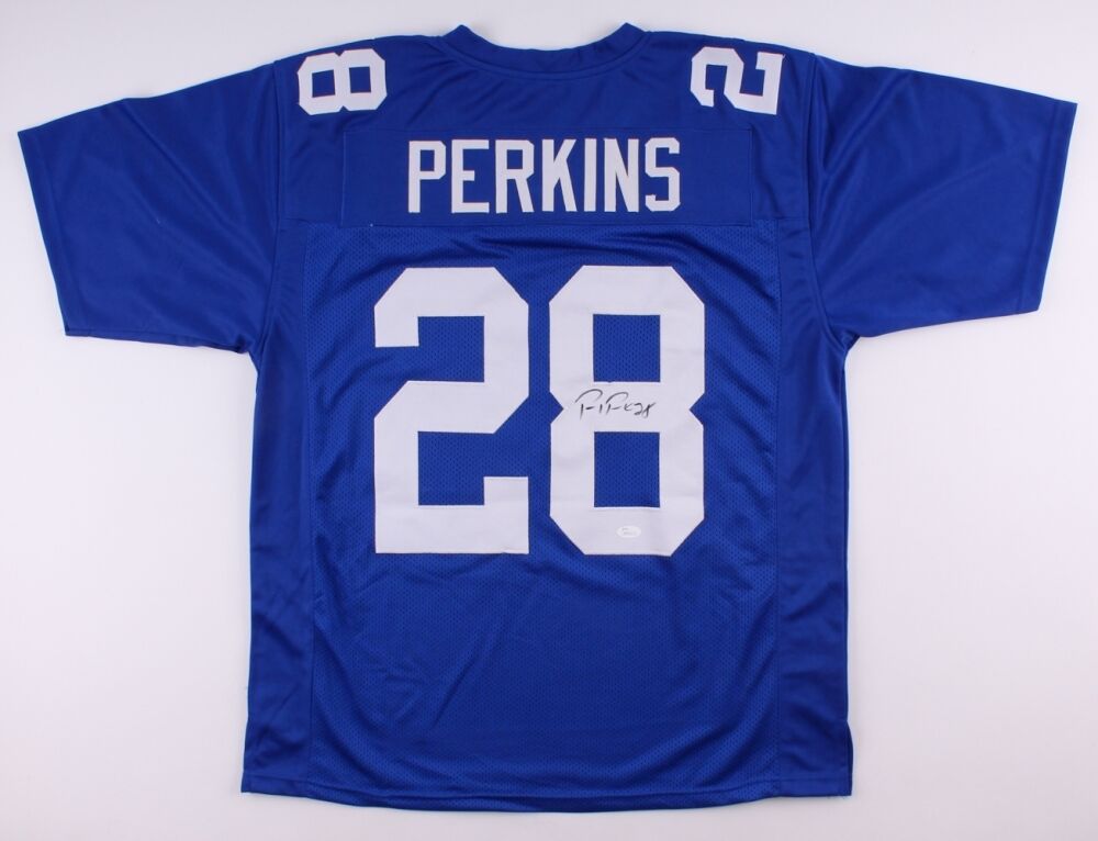 Custom on-field style jersey. Everything is sewn on, size XL. Hand-signed in black felt-tip pen by Paul Perkins. The lot / autograph(s) includes an official James Spence Authentication (JSA) hologram and matching COA for authenticity purposes. The signing of this item was witnessed by JSA.Authentication: JSA COA