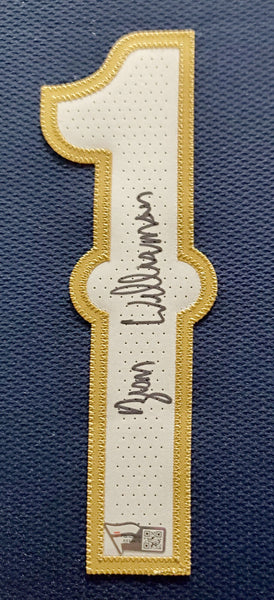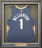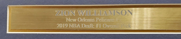 This is a framed Blue Nike New Orleans Pelicans Jersey, approximately 31x36 with the frame, that has been hand signed by Zion Williamson. This item has been certified authentic by Fanatics and comes with their tamper-proof sticker and matching certificate of authenticity.
