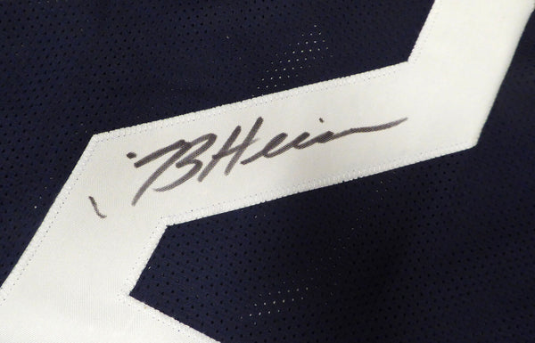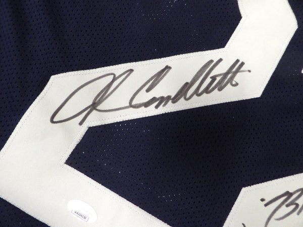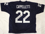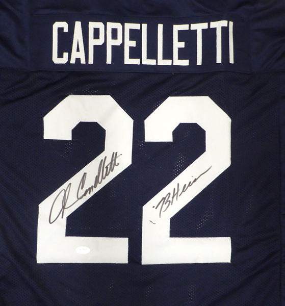This is a Blue Jersey that has been hand signed by John Cappelletti. This is a custom jersey with no name brand. The approximate size is XL. It has nice sewn in name and numbers. This item was inscribed "73 Heisman." There are marks on the item as shown. This item has been certified authentic by JSA and comes with their tamper-proof sticker and matching certificate of authenticity.