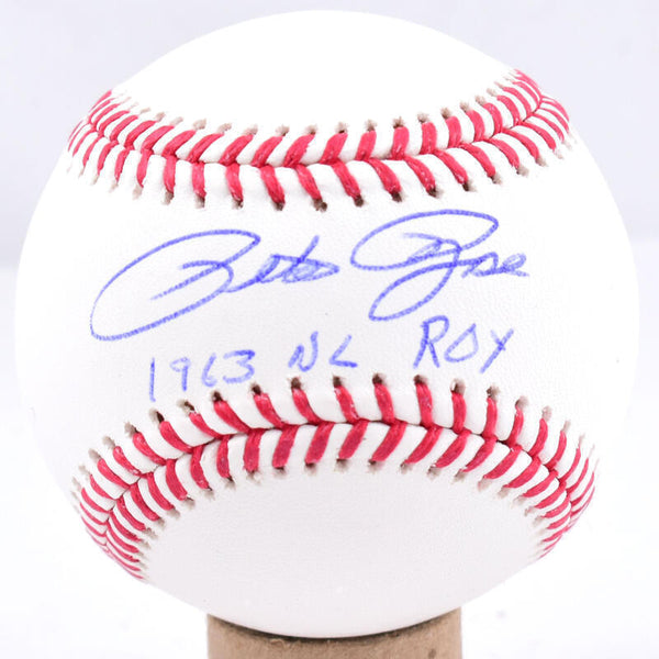 This is a hand autographed Baseball of Pete Rose. Inscribed 1963 NL ROY. This is a Official Game Ball Major League Baseball. This item has a Beckett Witness Authentication, which comes with a Beckett numbered hologram and a QR code for verification.You can view this item on the Beckett website and it shows when and where the item was signed. It was signed either at a public autograph appearance or a private signing. This is a stock photo of the item. Although you may not receive this exact item, the item you receive is virtually identical and brand new in great shape. Pete Rose Autographed Rawlings OML Baseball w/ 1963 NL ROY - Beckett W Hologram *Blue This is a hand autographed Baseball of Pete Rose. Inscribed 1963 NL ROY. This is a Rawlings Official Game Ball Major League Baseball. This item has a Beckett Witness Authentication, which comes with a Beckett numbered hologram and a QR code for verification. You can view this item on the Beckett website and it shows when and where the item was signed. It was signed either at a public autograph appearance or a private signing. This is a stock photo of the item. Although you may not receive this exact item, the item you receive is virtually identical and brand new in great shape.