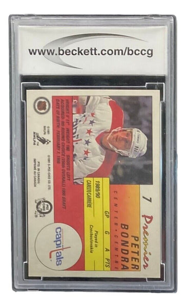 Featured is a Peter Bondra 1990-91 O-Pee-Chee Premier #7 rookie trading card. This card has been encapsulated by Beckett, receiving a Mint 10 condition grade. This card would make a great addition to any sports memorabilia collection!. SPECIFICATIONS Autographed By: Team: Sport: Hockey Authentication: