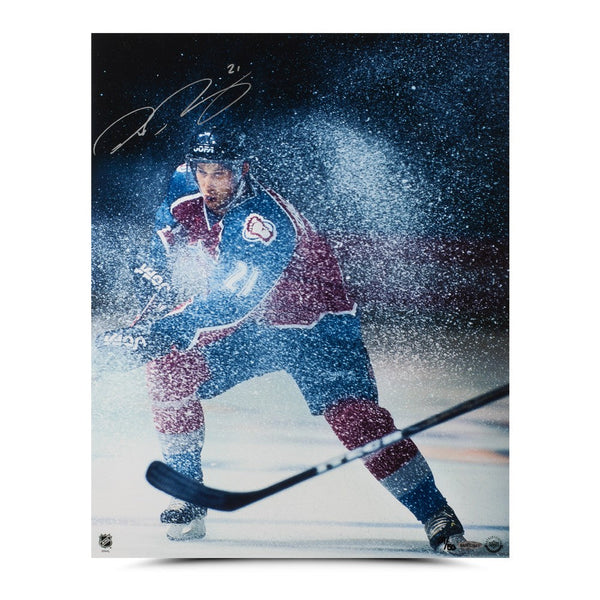 One of the most accurate marks of greatness at the center position is the ability to make the right decisions with the puck despite tremendous pressure coming from all angles. Even as a rookie in Quebec, Peter Forsberg had the rare ability to locate the open teammate for a quality opportunity to put the puck in the back of the net. When the organization relocated to Colorado following his rookie season, he became one of the top passers in the entire NHL. He finished in the top four in the NHL in assists per game nine times in his 13-year career, leading the league three times. His 0.90 career assists per game mark ranks fourth behind Wayne Gretzky, Mario Lemieux and Bobby Orr and his 1.25 career points per game average is eighth on the all-time list. The guys ahead of him on that list are all in the Hockey Hall of Fame except for Sidney Crosby, who is still active and has a spot in the Hall of Fame awaiting him as well. The Hall of Fame came calling for Forsberg in 2014 as he joined the greatest of all time in enshrinement in Toronto. In this image, the Swede shows his tremendous focus with a flurry of ice coming at his face. Forsberg has signed this limited edition (50) Ice Storm 16" x 20" image in silver paint pen. His signature is deemed authentic by virtue of Upper Deck Authenticated's Five Step Process.