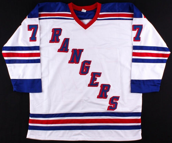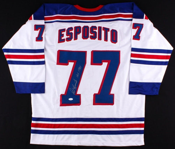 Custom on-ice style jersey. Everything is sewn on, size XL. Hand-signed in silver felt-tip pen by Phil Esposito. (Chicago Blackhawks, Boston Bruins, New York Rangers, HOF) The lot / autograph(s) includes an official James Spence Authentication (JSA) hologram and matching COA for authenticity purposes. The signing of this item was witnessed by JSA.Authentication: JSA COA