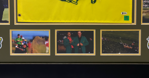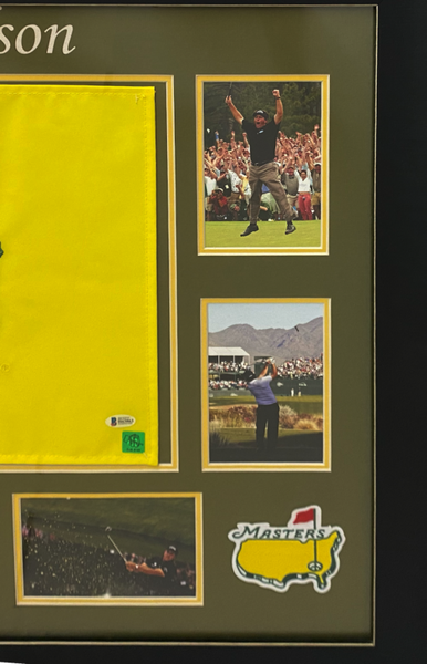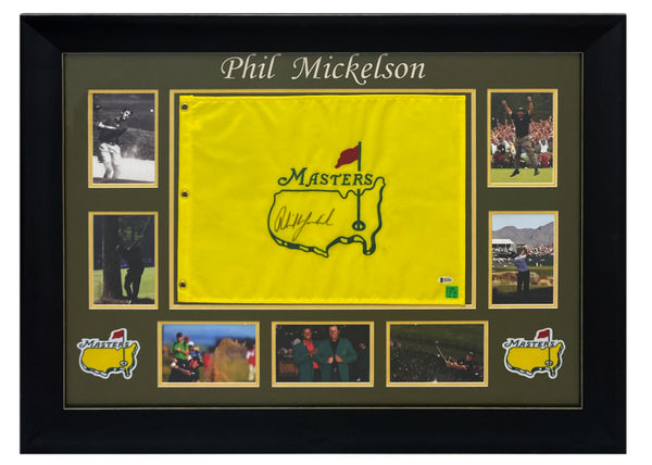 Phil Mickelson Autographed Masters Pin Flag Custom Framed Display with Photos Beckett Authenticated The signature was witnessed by a representative from Beckett Authentication and includes their hologram. The overall dimensions of this framed item are 37" x 28" Personally Autographed by Phil Mickelson Includes tamper-evident hologram.
