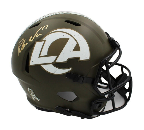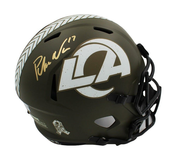 A Los Angeles Ram Speed Replica Salute to Service NFL Helmet hand signed by Puka Nacua. The item and signature are in excellent condition. Puka is a football wide receiver for the Los Angeles Rams. He was drafted in 2023 after playing for the BYU Cougars. He played in the Pro Bowl his rookie year. AUTHENTICATION: The item has been tagged with a Fanatics Authentic Serial Numbered and Databased Hologram