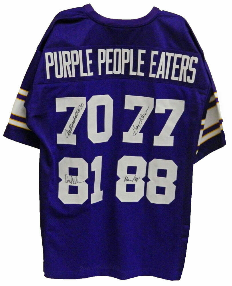 Purple People Eaters signed purple custom throwback jersey. Jersey has four sets of numbers to represent each member and the name plate Purple People Eaters. The jersey is signed by Alan Page, Carl Eller, Jim Marshall and Gary Larsen. Item comes with a Schwartz Sports Memorabilia tamper-proof numbered hologram and Certificate of Authenticity which can be verified online. Jersey is size XL.