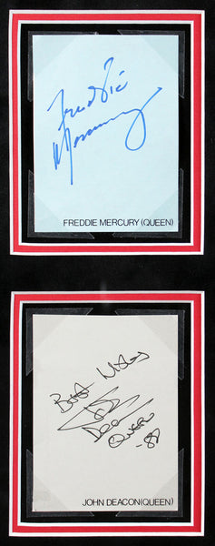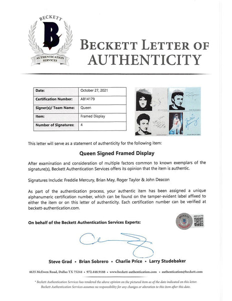 This Autographed Framed Display has been Personally Signed by Freddie Mercury, Brian May, Roger Taylor, John Deacon of Queen. This item is 100% Authentic to include a hologram by Beckett Authentication Services. This item may come with the new Beckett Authentication hologram that has a scannable QR code rather than the traditional COA. If you would like to have a COA, you are welcome to reach out to Beckett for a printed certification once you receive your item. The authenticity can be verified on Beckett Authentication Services website. This item has been professionally framed to overall dimensions of approximately 35 x 36 inches.