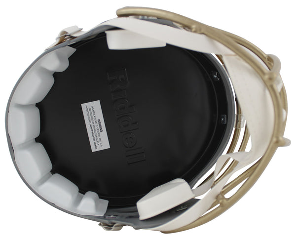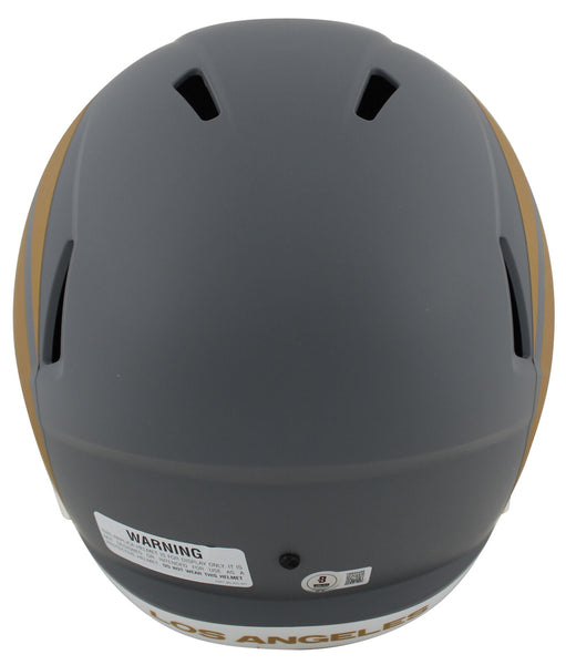 This Autographed Alternate Slate Riddell Full Size Speed Rep Helmet with the inscription of "HOF 99" has been Personally Signed by Eric Dickerson of the Los Angeles Rams. This item is 100% Authentic to include a hologram by Beckett Authentication Services. This item will come with an affixed Beckett Authentication Services (BAS) authentication sticker, which includes a scannable QR code to verify authenticity. Please note that Beckett no longer provides serial-numbered COA cards, and the attached BAS sticker will serve as the complete authentication for this item. This is a BAS Witnessed Protection Program item which means a Beckett Authentication Service representative was present when this item was being signed. We conducted an autograph signing with Eric Dickerson where multiples of the same item were signed. While the photographs are representative of this item, the size, placement and strength of the signature may vary. Each item is hand signed, therefore, each autograph is unique. This item can be verified through BAS Witnessed.