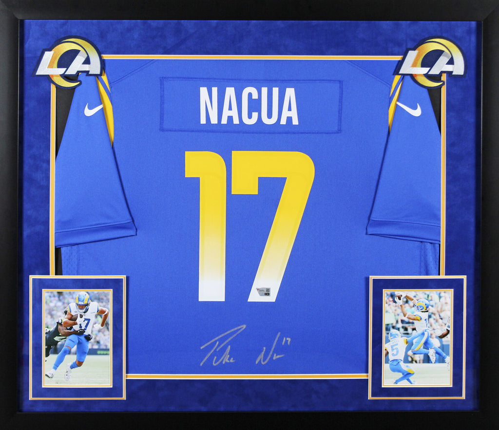 This Autographed Blue Nike Game Framed Jersey has been Personally Signed by Puka Nacua of the Los Angeles Rams. This item is 100% Authentic to includes a numbered hologram by Fanatics. We conducted an autograph signing with Puka Nacua where multiples of the same item were signed. While the photographs are representative of this item, the size, placement and strength of the signature may vary. Each item is hand signed, therefore, each autograph is unique. This item can be verified through Fanatics. This item has been professionally framed to overall dimensions of approximately 32 x 37 inches. These jerseys are framed to order, it takes approximately 3-4 business days for framing to be completed.