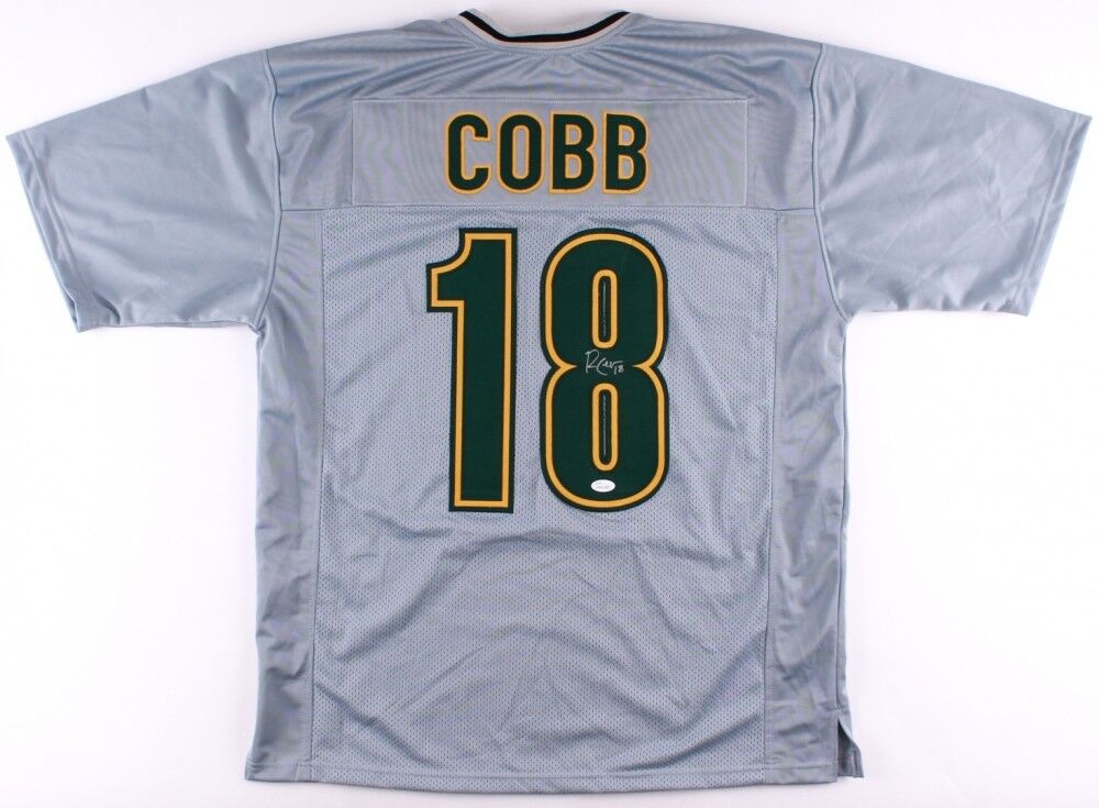 Custom on-field style jersey. Everything is sewn on, size XL. Hand-signed in silver paint pen by Randall Cobb (Packers). The lot / autograph(s) includes an official James Spence Authentication (JSA) hologram and matching COA for authenticity purposes. The signing of this item was witnessed by JSA.Authentication: JSA COA
