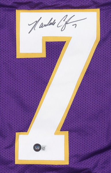 Custom on-field style jersey. Everything is sewn on. Jersey has been hand-signed in black Sharpie pen by Randall Cunningham.Cunningham was selected in the second round of the 1985 NFL Draft by the Eagles, with whom he remained through the 1995 season. Following 11 seasons with the team, he announced his retirement from football but returned after a year away from the game to join the Vikings. The autograph includes an official Beckett Authentication Services serially numbered hologram and QR Code Card for authenticity purposes. The signing of this item was witnessed by Beckett.Authentication: Beckett Hologram with QR Code Card