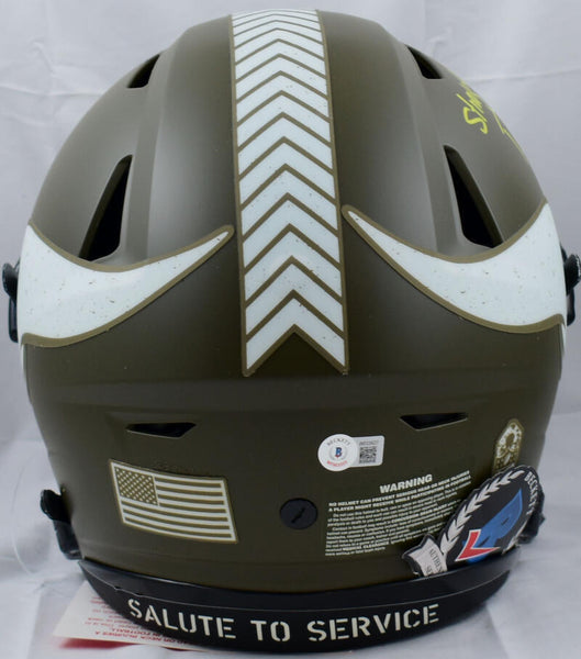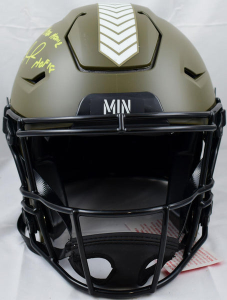 Randy Moss Autographed Minnesota Vikings F/S Salute to Service Speed Flex w/2 insc.- Beckett W Hologram *Yellow This is a hand autograph of Randy Moss of the Minnesota Vikings on a Riddell Football Full Size Salute to Service Speed Flex Authentic Helmet. Inscribed Straight Cash Homie and HOF. This item has a Beckett Witnessed Authentication, which comes with a numbered sticker hologram and a QR code for verification. You can view this item on the Beckett Authentication website and it shows when and where the item was signed. It was signed either at a public autograph appearance or a private signing. This is a stock photo of the item. Although you may not receive this exact item, the item you receive is virtually identical and brand new in great shape.