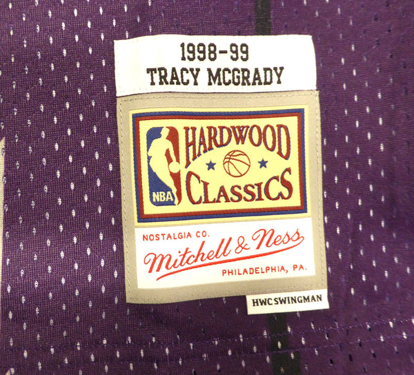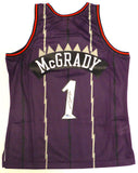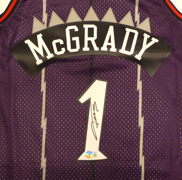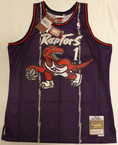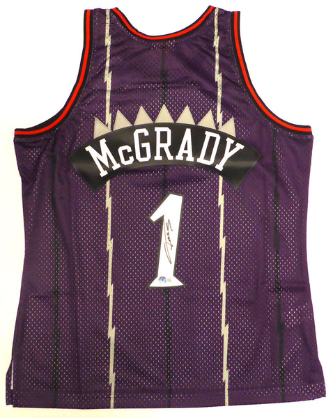 This is a Purple Authentic 1998-99 Mitchell & Ness Toronto Raptors Jersey that has been hand signed by Tracy McGrady. This jersey is Size L. This item has been certified authentic by Beckett Authentication (BAS) and comes with their tamper-proof QR Code sticker that can be verified on the Beckett-authentication.com.