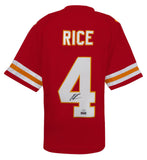 Rashee Rice signed red custom football jersey. Item comes with a JSA (James Spence Authentication) tamper evident numbered sticker and matching Certificate of Authenticity which can be verified online. Jersey is size XL.