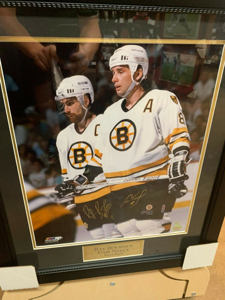This 16x20 photo custom framed to 20x24 has been personally hand-signed by Ray Bourque and Cam Neely of the Boston Bruins.100% Authentic. Certificate of Authenticity by New England PictureExact location of signatures may vary