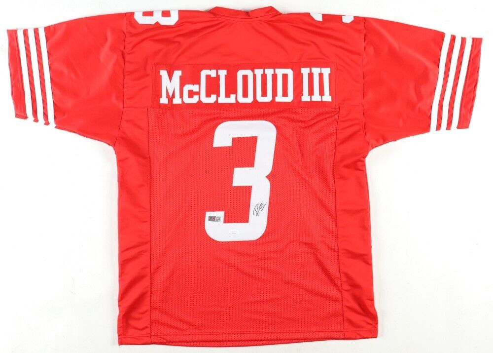 Custom on-field style jersey with everything is sewn on, size XL. Hand-signed in black felt-tip pen by Ray Ray McCloud (49ers)The autograph(s) includes an official James Spence Authentication (JSA) hologram and matching COA for authenticity purposes. The signing of this item was witnessed by JSA.Authentication: JSA COAThe lot / autograph(s) includes an official Players Ink Authentication hologram for authenticity purposes.Authentication: PIA Hologram