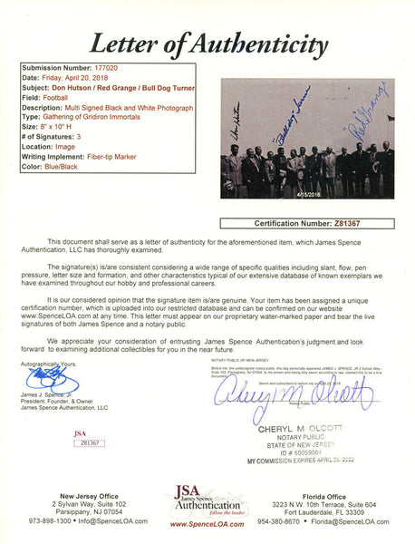 The number in the listing title is just an inventory sku for our records and is not the authentication number. This is the exact item that you will receive so please see pictures for condition. This is an 8x10 photo that was personally autographed by Red Grange, Don Hutson and Clyde Bulldog Turner. Includes a letter of authenticity from James Spence Authentication (JSA) and Denver Autographs.FREE SHIPPING within the USA on orders over $10!