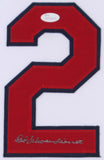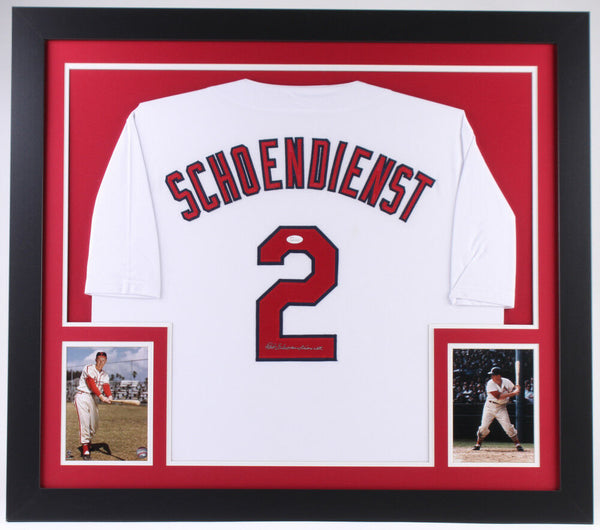 Custom frame measures approximately 31" x 35" in size and features a jersey which has been hand-signed in silver paint pen by Red Schoendienst (D. 2018, HOF). The lot / autograph(s) includes an official James Spence Authentication (JSA) hologram for authenticity purposes. The signing of this item was witnessed by JSA.Authentication: JSA Hologram