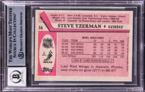 This Autographed Auto Graded Gem Mint 10! 1987 Topps #56 Card has been Personally Signed by Steve Yzerman of the Detroit Red Wings. This item is 100% Authentic, it comes slabbed and authenticated by Beckett Authentication Services. The authenticity can be verified on Beckett Authentication Services website.