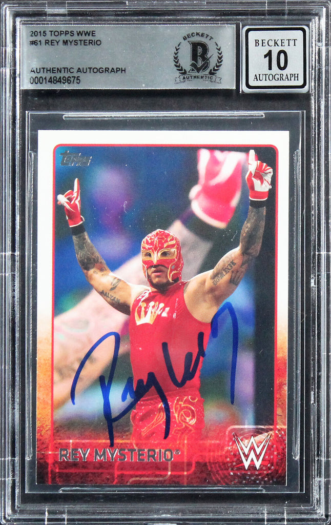 This Autographed Auto Graded Gem Mint 10! 2015 Topps WWE #61 Card has been Personally Signed by Rey Mysterio. This item is 100% Authentic, it comes slabbed and authenticated by Beckett Authentication Services. The authenticity can be verified on Beckett Authentication Services website.
