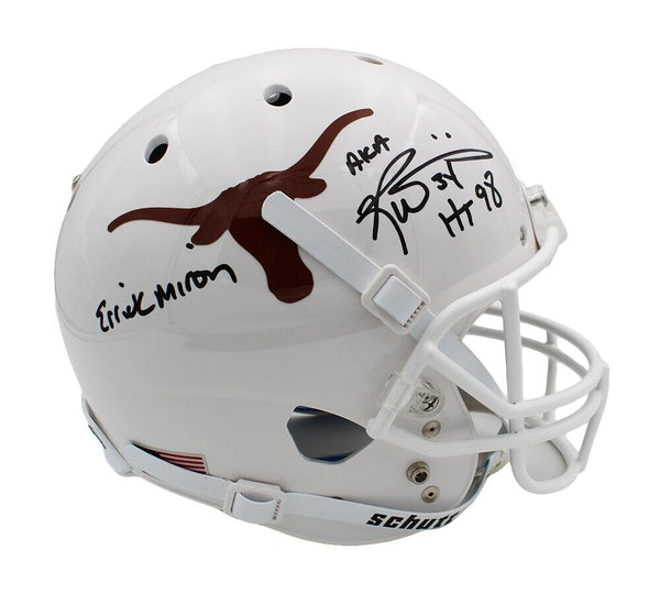 A Texas Longhorns Schutt Replica NCAA Helmet hand signed by Ricky Williams. The item and signature are in excellent condition. In addition to signing his name, Ricky inscribed "Errick Miron AKA" on the item. Ricky Williams is a former NFL running back, he won the 1998 Heisman Trophy, Maxwell Award, Walter Camp Award, he is a Pro Bowler, and First-team All-Pro. AUTHENTICATION: The item is accompanied by a Ricky Williams Exclusive Certificate of Authenticity - Ricky Williams Exclusive Serial Numbered and Databased Hologram - Picture of Ricky from the Signing -