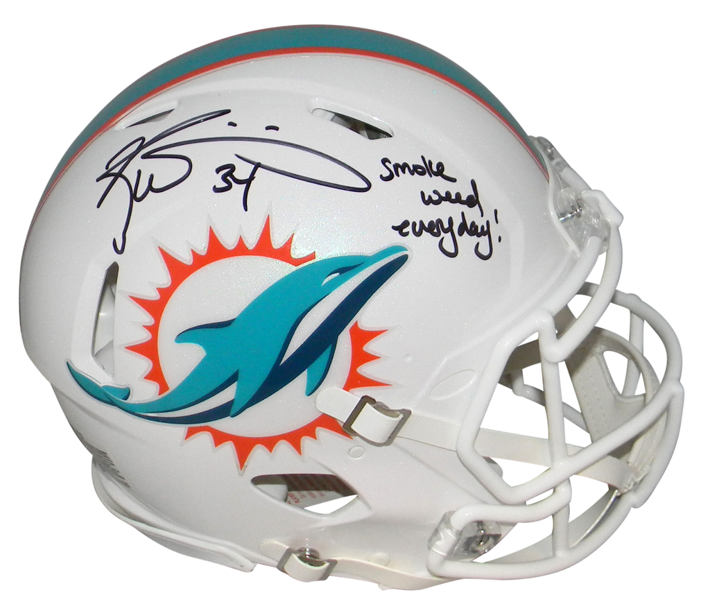 Ricky Williams, former Pro Bowl running back for the Miami Dolphins, has hand signed this Dolphins Riddell Speed full-size authentic helmet at a private signing. He included the inscription "Smoke Weed Everyday". This helmet is fully padded inside like the ones worn on the field. This item comes with a certificate of authenticity (COA) from Beckett Authentication Services and was signed in the presence of one of their representatives. You will receive a serial-numbered COA along with a matching serial-numbered sticker on the helmet. The authenticity can be verified online by entering the serial number.Item pictured may not be the exact item you will receive. It will be similar quality, and we guarantee your satisfaction.