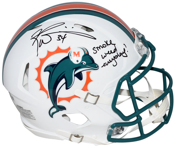Ricky Williams, former Pro Bowl running back for the Miami Dolphins, has hand signed this Dolphins Riddell Speed full-size authentic helmet at a private signing. He included the inscription "Smoke Weed Everyday" with his signature. This helmet is fully padded inside like the ones worn on the field. This item is authenticated by Beckett Authentication Services and was signed in the presence of one of their representatives. Their tamper-evident hologram featuring a QR code and serial number is on the item. The authenticity can be verified online by entering the serial number or scanning the QR code.Item pictured may not be the exact item you will receive. It will be similar quality, and we guarantee your satisfaction.