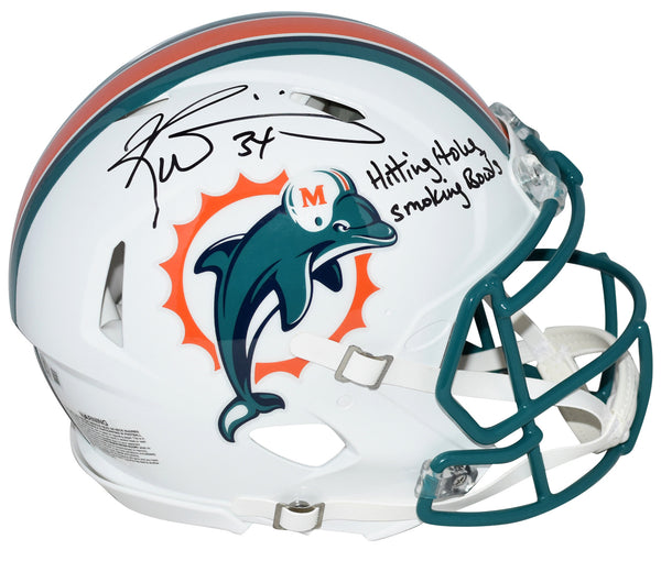 Ricky Williams, former Pro Bowl running back for the Miami Dolphins, has hand signed this Dolphins Riddell Speed full-size authentic helmet at a private signing. He included the inscription "Hitting holes, smoking bowls" with his signature. This helmet is fully padded inside like the ones worn on the field. This item is authenticated by Beckett Authentication Services and was signed in the presence of one of their representatives. Their tamper-evident hologram featuring a QR code and serial number is on the item. The authenticity can be verified online by entering the serial number or scanning the QR code.Item pictured may not be the exact item you will receive. It will be similar quality, and we guarantee your satisfaction.