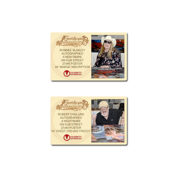 This 1984 A Nightmare on Elm Street 27x40 Single Sided Movie Poster has been personally hand-signed by Robert Englund, Heather Lagenkamp, Amanda Wyss, Ronee Blakley during their signings with Celebrity Authentics. In Wes Craven's classic slasher film, several Midwestern teenagers fall prey to Freddy Krueger (Robert Englund), a disfigured midnight mangler who preys on the teenagers in their dreams -- which, in turn, kills them in reality. After investigating the phenomenon, Nancy (Heather Langenkamp) begins to suspect that a dark secret kept by her and her friends' parents may be the key to unraveling the mystery, but can Nancy and her boyfriend Glen (Johnny Depp) solve the puzzle before it's too late? Ships affixed with Celebrity Authentics serial-numbered and tamper evident Authentication Hologram and includes Celebrity Authentics Certificates of Authenticity featuring picture of talent signing poster. Please note: with multiples signed by the actor, a sample photo is used from stock to represent what you will receive. Exact autograph size and placement may vary.