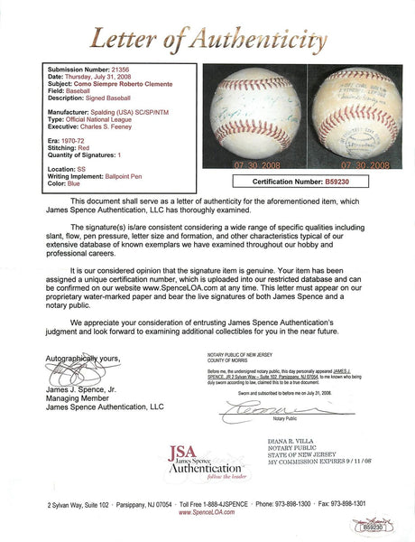 This is a "Como Siempre" Signed Authentic ONL Charles Feeney Spalding 1970-72 Baseball that has been Personally Signed & Autographed by Roberto Clemente of the Pittsburgh Pirates. Clemente single signed balls are very hard to find. He added "Como Siempre" along with his signature. This item is 100% Authentic to include a Certificate of Authenticity (COA) / hologram by JSA #B59230.We offers a 100% Lifetime Guarantee on all Autographed & Signed Pittsburgh Pirates Roberto Clemente memorabilia.