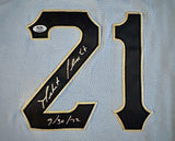 Custom on-field style style jersey with everything sewn on, size adult XL. Hand-signed and inscribed by Roberto Clemente Jr (The son of Pirates Superstar Roberto Clemente Sr.).The inscription that was made by Clemente Jr. marked the date that Clemente had his 3000th hit on the last day of the 1972 season which ironically was his final career hit as he was tragically killed in a plane crash just 3 months later. On New Year's Eve, December 31st, 1972, Roberto Clemente chartered a plane for a humanitarian mission to earthquake-striken Nicaragua. Even though Clemente had some concerns about the plane's safety, he flew. Clemente's flight crashed into the Atlantic Ocean shortly after takeoff killing him and all four crew members. Today, Clemente is recognized as one of the few baseball immortals to ever live.The autograph includes an official PSA/DNA hologram and QR Code card for authenticity purposes. The signing of this item was witnessed by PSA.Authentication: PSA Hologram & QR Code card