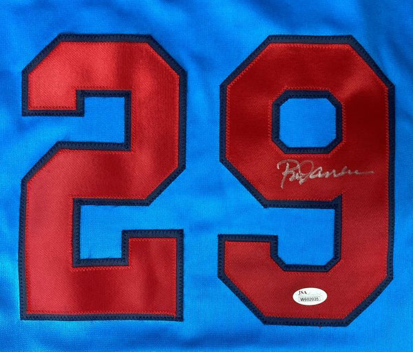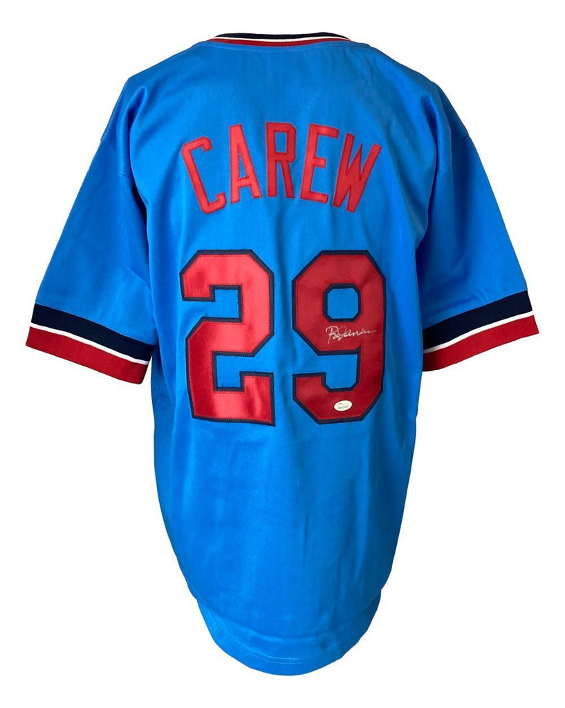 Featured is a Rod Carew signed custom baseball jersey. This jersey has been hand signed by Carew and comes with the JSA hologram and certificate of authenticity. This jersey features professionally sewn letters and numbers and is size XL. This jersey has no team tags or emblems and is intended as a sports collectible. This jersey would make a great addition to any sports memorabilia collection! SPECIFICATIONS Autographed By: Rod Carew Team: Minnesota Twins Sport: Baseball Authentication: James Spence Authentication (JSA)