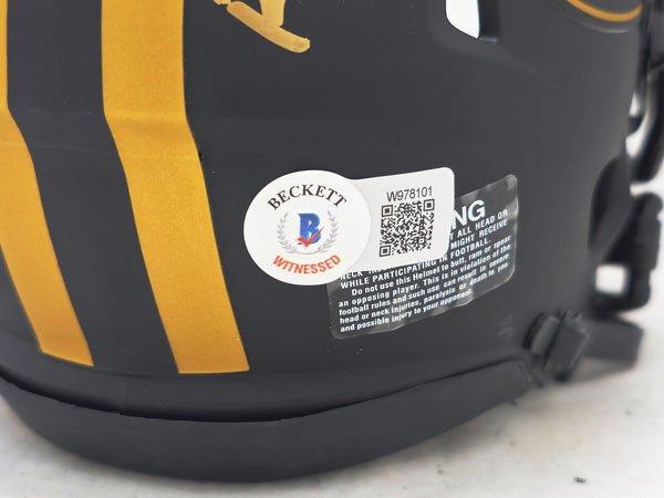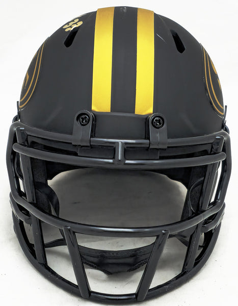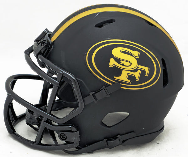 This is a San Francisco 49ers Eclipse Black Speed Mini Helmet that has been hand signed by Roger Craig. The Eclipse helmets are very delicate and often have some marks or scratches on them. There is an imperfection in the signature as shown. This item has been witnessed and certified authentic by Beckett Authentication (BAS) and comes with their tamper-proof witness hologram.