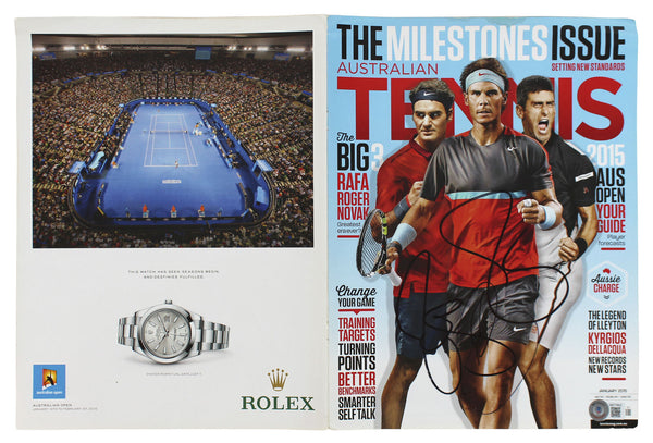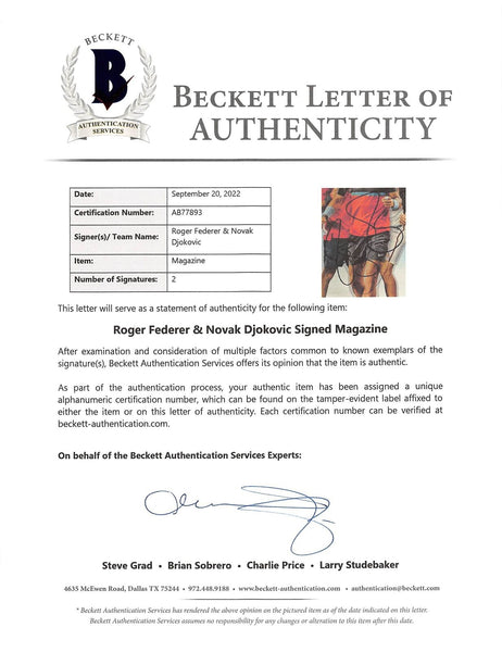 This Autographed Australian Tennis Magazine Cover has been Personally Signed by Roger Federer & Novak Djokovic. This item is 100% Authentic to include a Certificate of Authenticity (COA) / hologram by Beckett Authentication Services. The authenticity can be verified on Beckett Authentication Services website.
