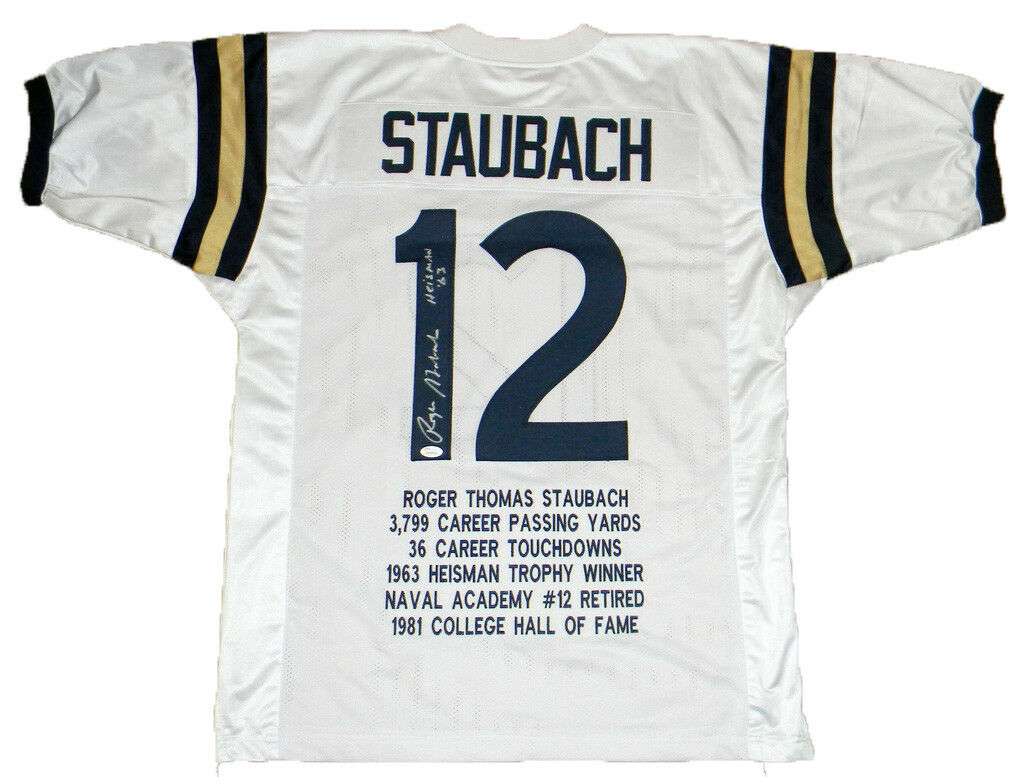 Roger Staubach, former Heisman Trophy winning quarterback for the Navy Midshipmen, has hand signed this white custom stat jersey at a private signing. He included the inscription "Heisman 63" with his signature. Jersey is size XL and all letters/numbers are sewn-on. This item comes with a certificate of authenticity (COA) from JSA - James Spence Authentication and was signed in the presence of one of their representatives. You will receive a serial-numbered COA along with a matching serial-numbered sticker on the jersey. The authenticity can be verified online by entering the serial number.Item pictured may not be the exact item you will receive. It will be similar quality, and we guarantee your satisfaction.