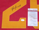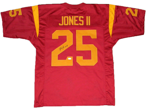 Ronald Jones II, former All-American running back for the USC Trojans, has hand signed this custom jersey at a private signing. Jersey is size XL and all letters/numbers are sewn-on. This item comes with a certificate of authenticity (COA) from JSA - James Spence Authentication and was signed in the presence of one of their representatives. You will receive a serial-numbered COA along with a matching serial-numbered sticker on the jersey. The authenticity can be verified online by entering the serial number.Item pictured may not be the exact item you will receive. It will be similar quality, and we guarantee your satisfaction.