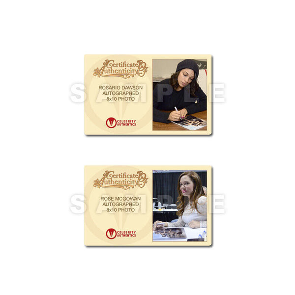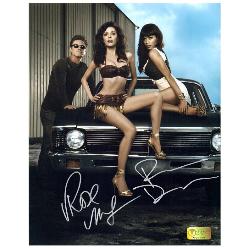 This 8x10 photo of Pam (Rose McGowan), Abernathy (Rosario Dawson) and Stuntman Mike (Kurt Russell) from the Grindhouse cast has been personally hand-signed by Rosario Dawson and Rose McGowan during their signings with Celebrity Authentics. Filmmakers Quentin Tarantino and Robert Rodriguez pay tribute to exploitation films of the 1970s with two features in one. Tarantino directs Death Proof, a slasher film, and Rodriguez directs Planet Terror, a zombie movie. Fictitious ads and movie trailers run during each feature's intermission. Ships affixed with Celebrity Authentics serial-numbered and tamper evident Authentication Hologram and includes Celebrity Authentics Certificates of Authenticity featuring picture of Rosario and Rose signing photo. Please note: with multiples signed by the actor, a sample photo is used from stock to represent what you will receive. Exact autograph size and placement may vary.