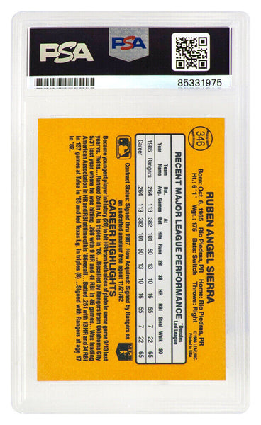 Ruben Sierra signed Texas Rangers 1987 Donruss rookie baseball trading card #346. The card has been authenticated and encapsulated by PSA/DNA and the number can be verified online.